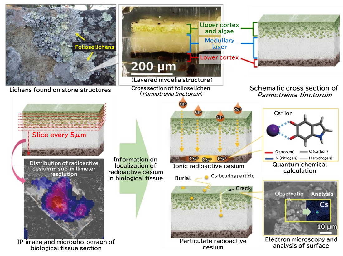 A research team of JAEA, Hosei University, and the National Museum of Nature and Science successfully identified the microscale localization of radioactive cesium in two chemical forms of ions and particles in lichens (lichen = a collective term for a symbiosis between a fungus and an alga) for the first time in the world, finally unveiling the mystery.