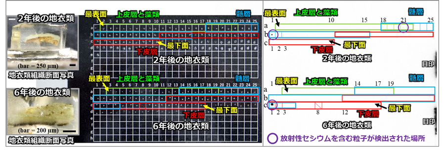 AA research team led by JAEA identified the parts of lichens’ body where radioactive cesium are distributed, by combining detection of radioactive materials using a special film and observation of tissues using a digital optical microscope.