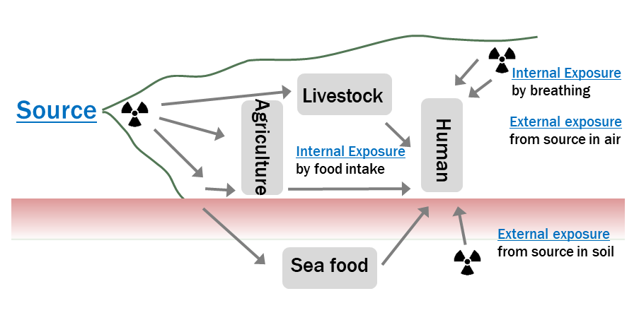 ARadiation exposure is classified into two groups. One is external exposure due to radiation coming from outside of human body, and the other is internal exposure caused by breathing air and eating foods.