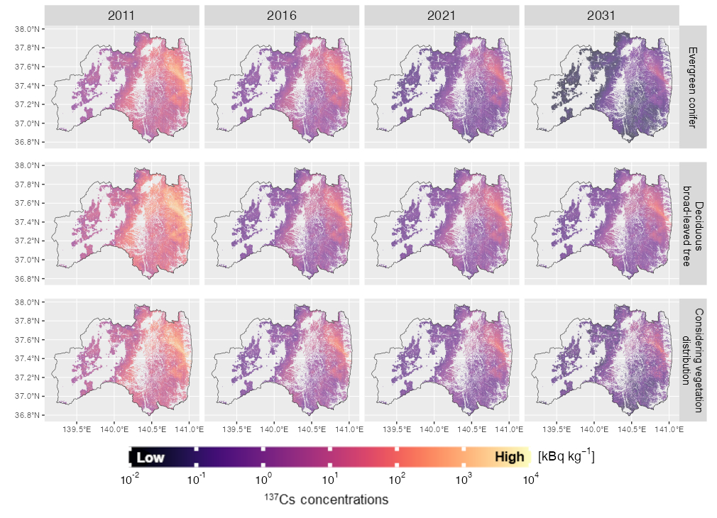 The result revealed that while 137Cs concentrations in the organic layer of the forest floor had been promptly decreasing since the accident, the decrease trend was dependent on differences in vegetation and mean annual temperature. A decline in the decrease speed was confirmed particularly in the deciduous broad-leaved forests and cool high-altitude areas, suggesting a possibility that 137Cs concentrations tend to remain relatively high.