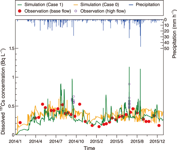 Case 0 was simulated assuming adsorption-distribution equilibrium for dissolved and particulate 137Cs, and Case 1 was modeled by considering trees and forest litter layers and linking the transfer within the forest to the watershed. Specifically, we modeled the availability of dissolved 137Cs, originating from organic matter decomposition and from the forest litter layer, to enter the river water due to an increase in the water level.