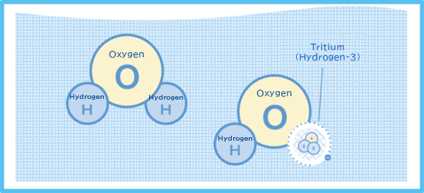 Similar to hydrogen atoms, most tritium atoms bind with oxygen atoms and exist in the form of “water.” A water molecule consists of two hydrogen atoms and one oxygen atom. In water, a tritium replaces a hydrogen atom, and the tritiated water behaves like normal water.