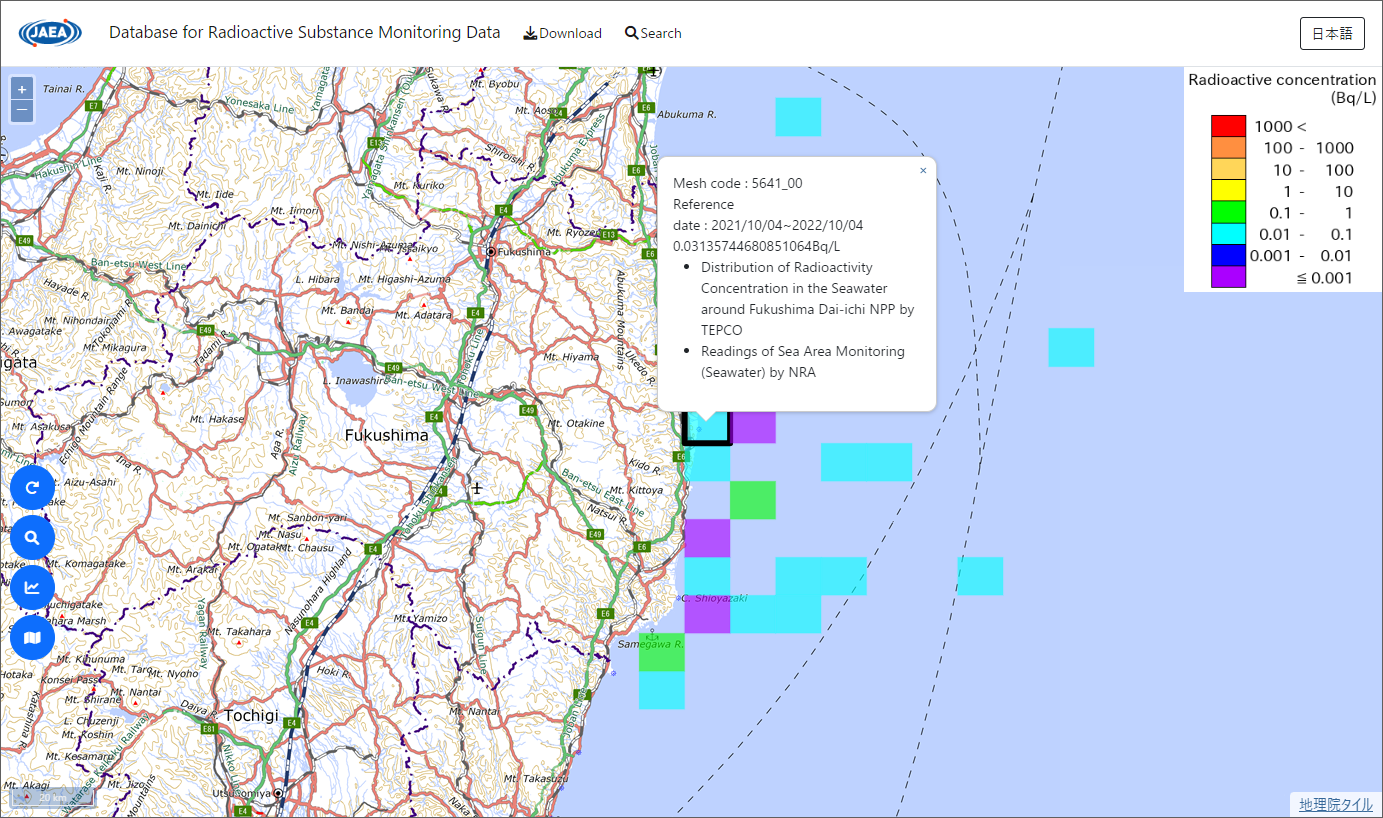 The tritium concentration in seawater near the NPS is periodically measured by the Japanese government, Fukushima Prefecture, and Tokyo Electric Power Company. On the top page of the site (https://emdb.jaea.go.jp/emdb/), when you click “SEA WATER,” set [Term] in the search condition, select H-3 (tritium) from the pull-down menu of [Nuclide], check [Middle classification] and [Measurement Items], and click "≪ Render Map".