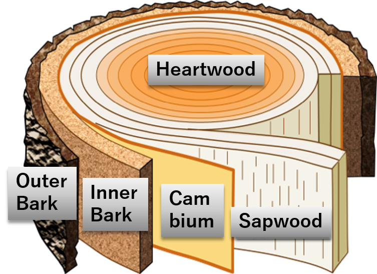 The central part of woods. Dark colored, high intensity and durability, and low water content. Heartwood is consisted of dead cells. - Sapwood