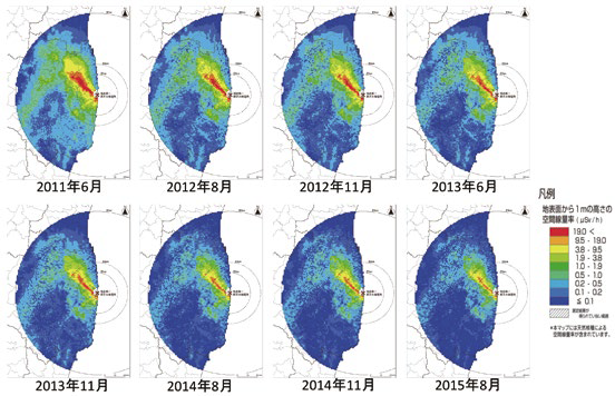 分布状況調査で得られた空間線量率分布の経時変化を図1に示す。この図は、80km圏内を1kmメッシュに分割し、各メッシュで1箇所、撹乱のない平坦地を選んでサーベイメータを使用して行った空間線量率の測定結果をベースに武宮らが作成した。データのないメッシュについては航空機サーベイのデータを地上値に規格化して加えている。経時的な空間線量率分布の変化が明確に見て取れる。
