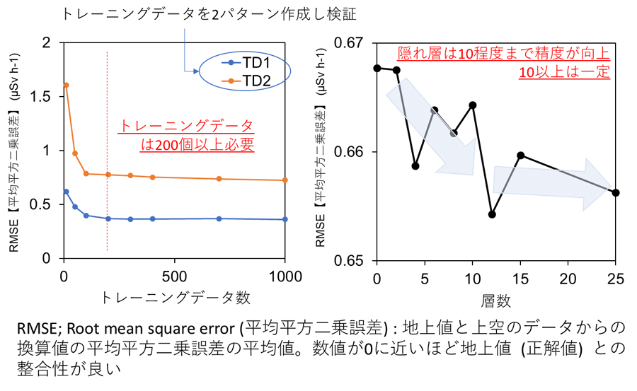 精度の良い換算を行うためのニューラルネットワークの構築条件を評価するため、必要となるトレーニングデータ(上空測定値と地上測定値の組み合わせ)の数とニューラルネットワークのパラメータ(層数)について評価を行いました。まず、ニューラルネットワーク構築におけるトレーニングデータ数を変化させ、トレーニングデータ数の増加に伴う換算結果の精度を検証しました。精度検証には、UAVと同じ地域で取得した地上の空間線量率を正解値とし、換算値と正解値の誤差(RMSE)の平均値を使用しました(図4)。図4に示したトレーニングデータは、測定高度が50-60 mであり、TD1は放射線の計数率が5000 cps以下のデータ、TD2は 5000-10000 cpsのデータを抽出し、機械学習を行いました。