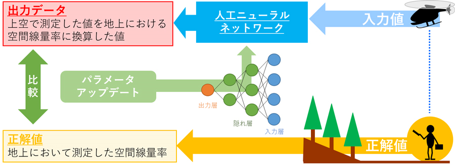 機械学習のアルゴリズムには、市販の機械学習ソフトウエアであるNeuralWorks Predict (米国NeuralWare社製) を利用しました。本ソフトウエアは、Microsoft社製のExcelの機能拡張として使用することができ、データが扱いやすい特徴があります。本ソフトウエアを利用し、これまで原子力機構で取得してきた上空でのγ線スペクトルデータをエネルギーごとに分割した計数率と、地表面とヘリの位置までの距離の情報を入力し、地上における空間線量率を出力するニューラルネットワークを構築しました(図3)。ニューラルネットワークを使用した学習では、出力される値と正解値との誤差を計算し、出力値が正解値に近づくようにニューラルネットワークのパラメータを調整し、最適な換算が行えるニューラルネットワークを構築します。学習し最適化されたニューラルネットワークを介して、上空で得られた放射線測定データが地上の空間線量率として換算されます。