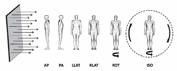 単色エネルギーの光子が単純な入射ジオメトリーにより人体に入射することを想定して、被ばく評価用の基礎データが整備される。図5は、一般に想定される標準的な入射方向ジオメトリーを示している。APは人体の前方から均一な平行ビームが入射する場合、PAは後方から入射する場合を示す。LLATは人体の左側方からRLATは右側方からの平行ビームの入射を表す。また、ROTは人体軸を中心に360°全方向から平行ビームが回転対称に入射する場合を、ISOは全ての方向から放射線が等方に入射する場合をそれぞれ示している。