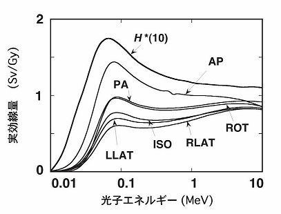 前方から光子が入射する場合(AP)には、人体自身による放射線の遮蔽効果が小さいため、実効線量が大きくなる。放射線が後方から入射する場合(PA)、AP入射に比べて遮蔽効果が大きくなり実効線量が小さくなる。一方、側方からの入射の場合(LLAT、RLAT)には腕や肩による遮蔽効果が大きくなり、AP入射やPA入射に比べて実効線量は小さくなる。回転対称入射(ROT)や等方入射(ISO)の実効線量の曲線はこれらの中間に位置する。