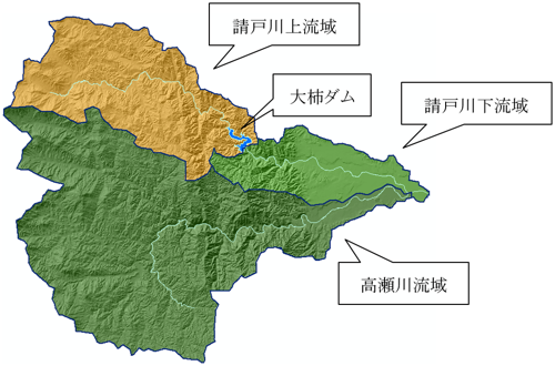 請戸川流域は、大きく請戸川及び高瀬川の流域に分けられる。前者は、大柿ダムを境界に、ダムを含む「請戸川上流域」及びダムから下流の「請戸川下流域」と呼び、後者は「高瀬川流域」と呼ぶ(図1)。