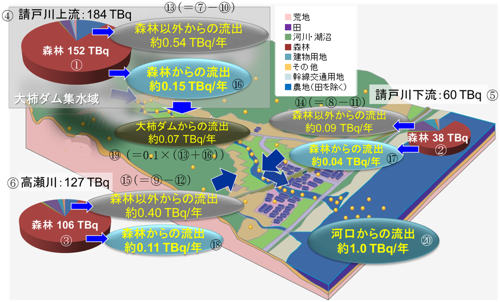 これらの結果、本評価地域における河口からのセシウムの流出量は、0.71×1012 Bqと計算され(表3)、他の既往研究結果1×1012 Bq1)と整合的な値を示した。また、上記の結果を包括的に表した図を、図2に示す。
