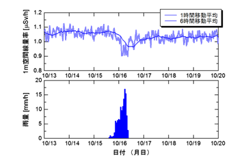 図9.2は観測期間のうち、大雨が降った期間(2013年10月16日前後)を抽出し、その前後の線量率の変化を示したものである。この結果から、大雨による空間線量率の増加は見られないことがわかる。なお、降雨が観測され始めてから空間線量率が低下している点については、雨水によるγ線の遮へい効果と考えられる。