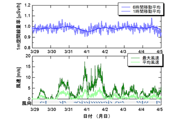 図9.3は観測期間のうち、強風の観測された期間を抽出し、その前後の線量率の変化を示したものである。風速10m/s以上の風が断続的に観測された2014年3月31日から4月1日にかけては、公園林のある北西からの風が卓越しているが、空間線量率の増加は認められなかった。