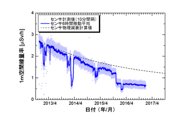 図9.1は福島県大熊町の大熊町役場東側公園に設置した気象観測装置一体型放射線センサーで観測された1m空間線量率の時間変化を示したものである。図には放射性セシウム(134Cs及び137Cs)の物理減衰による計算値も合わせて示している。1m空間線量率は物理減衰に従い減少傾向にあることがわかる。各年の冬期に見られる線量率の低下は積雪によるγ線の遮へい効果と考えられる。