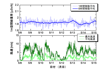 図9.5は観測期間のうち、強風の観測された期間を抽出し、その前後の線量率の変化を示したものである。2014年5月上旬から中旬にかけて、風速10m/s以上の風が数日間観測されたが、空間線量率の増加は認められなかった。