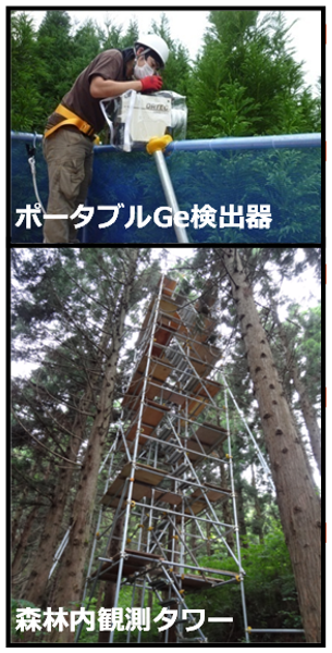 福島県の川俣町山木屋地区では、スギ壮齢林(35年生)、スギ若齢林(19年生)及び広葉樹混交林に観測タワーが設置され、樹冠(森林の上部)と林床(森林の地表面)における空間線量率の測定が2011年7月より実施されている(図10.2)。