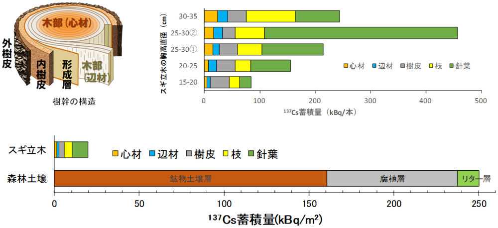 - 上右) 採取したスギ立木の各部におけるセシウム137の蓄積量