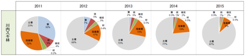 図2.5 2011~2015年における川内村スギ林の放射性セシウム(134Cs+137Cs)における部位別の分布割合