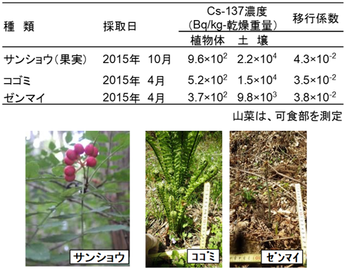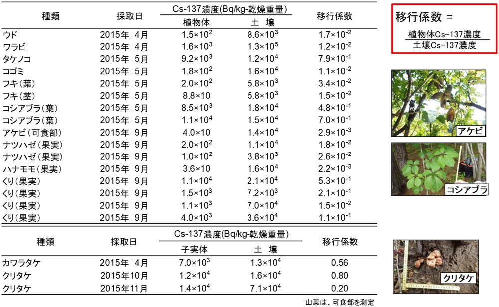 また、人の生活圏に隣接したアカマツ-コナラ林に生育する野生の山菜やキノコ類についても同様に、植物体と土壌を合わせて採取し、移行係数として整理した(図2.10)。その結果はスギ林と同様であり、山菜で低くキノコ類で移行係数が高い結果となった。コシアブラとタケノコは、山菜でも比較的高い移行係数であった。
