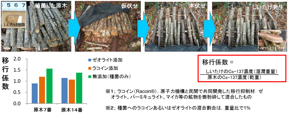 移行抑制剤として、原子力機構が民間企業と共同開発したラコイン(ゼオライト、バーミキュライト及びマイカ等の鉱物を微粉砕し混合したもの)及びゼオライトを使用し、種菌に重量比で1%添加した。試験では、移行抑制材を添加しない種菌、ゼオライト添加の種菌及びラコイン添加の種菌の3種類を用意し、種菌を植菌したコナラ原木の放射性セシウム濃度と、それぞれの種菌から発生したシイタケの放射性セシウム濃度を測定した。分析結果は、原木の放射性セシウム濃度に対する発生シイタケの放射性セシウム濃度の比である移行係数として整理した。その結果、移行抑制材を添加しない種菌から発生したシイタケと比較し、移行抑制剤を添加した種菌から発生したシイタケでは放射性セシウムの濃度が6割から8割程度に低減する効果が確認できた。ただし、シイタケの発生数が少なかったため、今後も試験を継続して実施する予定である。
