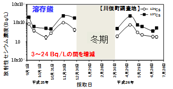 林床に直接沈着ないしは移行した放射性セシウムは、落葉落枝を含む堆積有機物層からその下の鉱質土層に移動する。一方で、土壌粘土粒子と強く結合することから、鉱質土層へ移動した放射性セシウムの大部分は、表層部分に貯留されている状態にある。この状態は、放射性セシウムが可溶化して下方へ移動し、地下水を汚染する可能性が極めて低いことを示す一方で、降雨や融雪による土砂流出時に、土粒子に吸着した高濃度の放射性セシウムも一緒に流出し、その結果、下流水域や河川氾濫原への集積(再汚染)が生じる可能性も示唆している。このため、国立環境研究所では、水田や市街地を主とする下流域に比べ、森林を主とする上流域が相対的に高汚染状態にある浜通り地方北部河川流域を対象として、山地森林流域における放射性セシウムの流出実態を把握するため、2012年度から水文観測や採水調査を継続実施している。