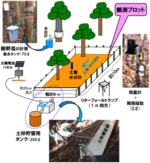 流出入状況の観測は主に降雨期の4~11月期に実施しており、降雨量、リターフォール量、樹幹流量、表面流量及び土壌移動量の観測とともに、水や土壌試料を採取し、放射性セシウム濃度の分析等を実施している。