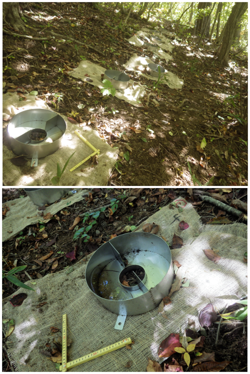 樹幹流については、樹木の胸高(約130cm高さ)付近にシリコンのコーキング材で漏れを防いだゴム製あるいはプラスチック製の樹幹流サンプラーを巻きつけて設置し、観測期間において樹木1本から流出する樹幹流下量(リットル)を観測する。樹幹流の場合には、樹木の枝や葉が林床を覆う面積(樹冠投影面積、m2)を別途計測しておき、「樹幹流下量(リットル)÷樹幹投影面積(m2)」、により、1m2あたりの樹幹流量(リットル/m2)を算出する。さらに、採取した樹幹流の放射性セシウム濃度の分析値から、「樹幹流下量(リットル/m2)×樹幹流の放射性セシウム濃度(Bq/リットル)」、により、単位面積当たり(1m2)の樹幹流による林床への放射性セシウム流入量(Bq/m2)を算出する。林内雨による単位面積当たりの林床への放射性セシウム流入量についても、林内雨量(mm = リットル/m2)とその放射性セシウム濃度(Bq/リットル)を乗ずることにより求められる(Bq/m2)。