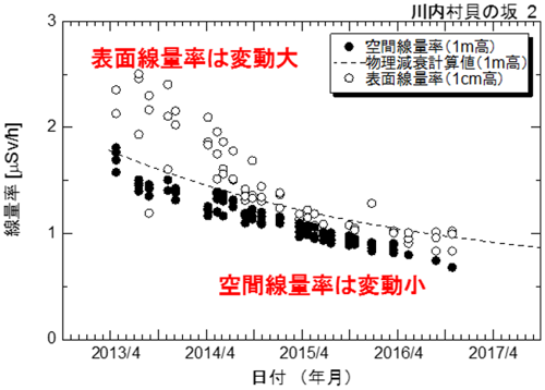 図9.4は福島県川俣町山木屋に設置した気象観測装置一体型放射線センサーで観測された1m空間線量率の時間変化を示したものである。図には放射性セシウム(134Cs及び137Cs)の物理減衰による計算値も合わせて示している。1m空間線量率は物理減衰に従い減少傾向にあることがわかる。各年の冬期に見られる線量率の低下は積雪によるγ線の遮へい効果と考えられる。また、2015年11月以降の空間線量率の低下は、周囲の除染作業によるものであることが確認されている。