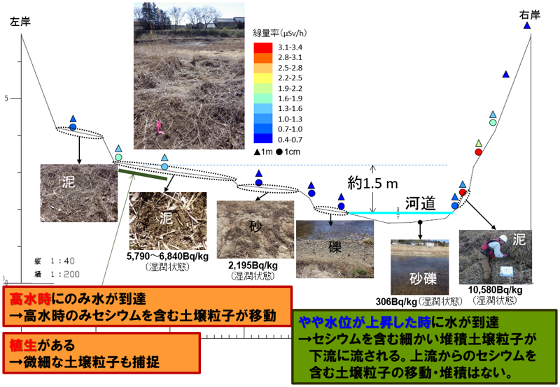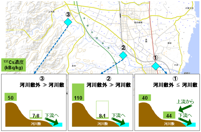 その結果、中流域では(図中②及び③)河川敷における濃度の方が河川敷外と比較して高いのに対し、下流域(図中①)では両者は同程度となっている。そのため、下流域の河川敷のうち放射性セシウムを含む土砂が堆積しやすい場所では、放射性セシウム濃度が増減を繰り返す傾向を示すことが分かった。また、他の浜通り河川水系でも同様の傾向が見られる。