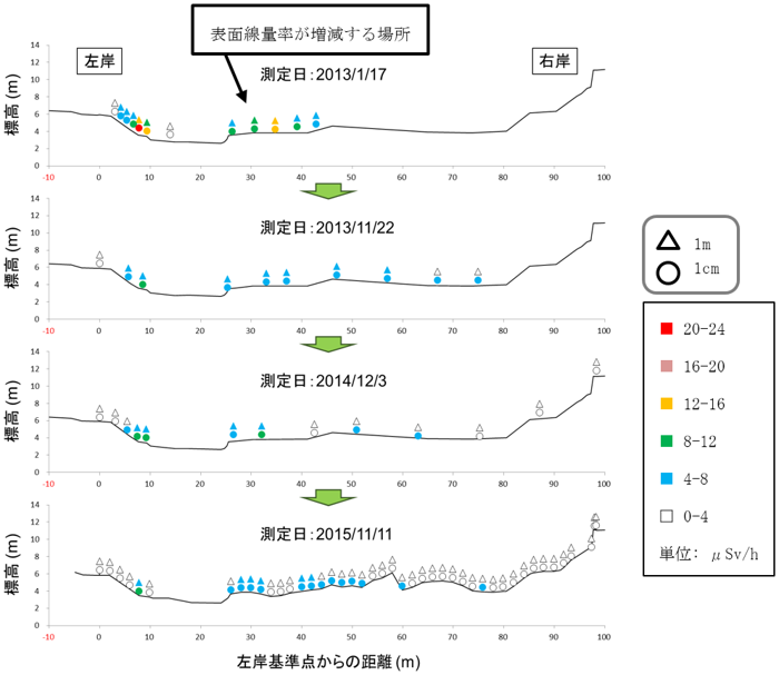 図3.2 河川敷横断面の線量率分布(請戸川下流域の例)