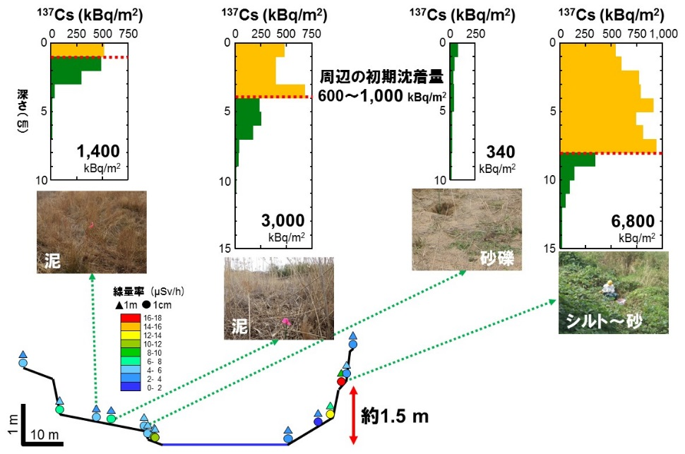 前項で示した、河川横断面の空間線量率と放射性セシウムの堆積環境の関係を明らかにするため、請戸川下流域の同一横断面上において、標高や堆積状況が異なる4箇所で、スクレーパプレートによる河川敷土壌の試料を異なる深さから採取し、放射性セシウム蓄積量の分布を比較した(図3.3)(中西2014)。河道付近では放射性セシウムの堆積が見られない一方、空間線量率が高く植生が分布する高水敷において放射性セシウム濃度が高いことが確認された。また、植生密度が高い地点程、放射性セシウムを含む土砂の堆積量が多いことも示された。これらの地点では、事故直後の初期沈着量(約600~1,000 kBq/m2、図中■)よりも有意に放射性セシウムの沈着量が多く(図中■)、河川系により上流から放射性セシウムを含む土砂が供給されていることが明らかになった。