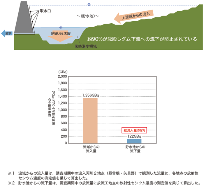 ダム湖への放射性セシウムの流入量とダム湖からの流出量を比較すると流入量に対して流出量は約1割程度であり、残りの約9割が湖底に蓄積している(図4.2)。これは、貯水池内の流速が河川の流速に対して非常に遅く流域から運搬された粒子が湖底に沈降しやすいためであり、これによって下流域への放射性セシウムを含む粒子の拡散が抑制されている。なお、ダム湖の中でも粒子は下流側に到達せず上流側に沈降し堆積するものが多い傾向があることも報告されている(飯島ほか2014)。