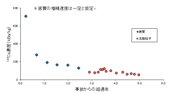 底質とセディメントトラップを用いて採取した沈降粒子の放射性セシウム濃度は、事故初期に急激に減少し、その後緩やかな減少傾向を示す(図4.3)。このような傾向は、チョルノービリ(チェルノブイリ)事故後の欧州の河川や福島第一原発事故後の福島県内の河川で認められた懸濁物質の放射性セシウム濃度の減少と同様の傾向である。