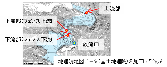 貯水池内の上流部と下流部(フェンスの下流)に超音波多層流向流速計を設置し、鉛直流速分布の連続観測を実施した。また、2014年10月の台風18号襲来時に、貯水池内の3地点で水温、濁度、溶存酸素等の水質の深度分布測定を行った(図4.5、中央の赤線がフェンス)。