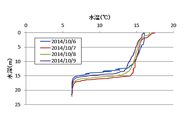 図4.7に湖内の濁度鉛直方向分布を示す。出水直後の10月6日の時点の上流部で濁度が最大約50 FTUとなるが、下流部では最大約20 FTU程度であった(1 FTUはおよそ1 mg/L)。あわせて、図4.8に下流部の水温鉛直方向分布を示す。この結果から、形成されている水温躍層は大きく破壊されていないことからも、全層が混合して濁水化するような大規模な出水イベントではなかったことが言える。そのため、下流部の下層で濁度が高い要因としては、出水時の流入水の影響ならびに夏期に貯水池内に形成された浮泥層によるものとで、底質の巻き上げの影響によるものではないと考えられる。