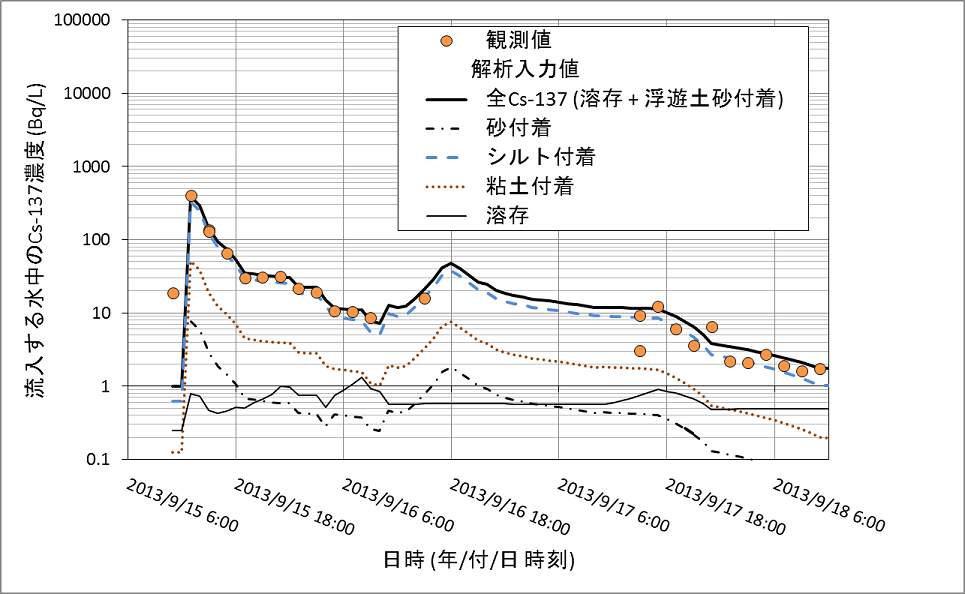図4.9 大柿ダムに流入する水中の放射性セシウム濃度の経時変化の観測値と解析入力値