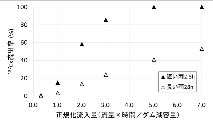 図4.11 降雨強度(流量)や継続時間と放射性セシウム流出率の関係(容量が107m3のダム湖の例)