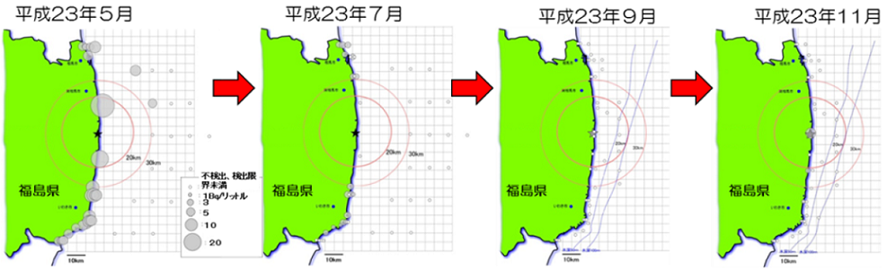 水産庁では、国内外に対して、現在の水産物の放射性物質の濃度や安全性に係る正確な情報を伝達し、風評被害の払拭や諸外国・地域における輸入規制の緩和・撤廃を目的として、「水産物の放射性物質の検査に係る報告書」を作成し、発表している(水産庁 2015)。図5.3に福島沖の海水中の放射性セシウムのモニタリング結果を示す。2011年5月に比べて、11月の段階で放射性セシウムの減少がみられる。これは、別に行われた同様な調査結果(原子力規制庁2017)とも整合的である。