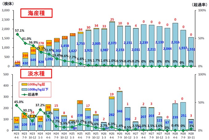 2011年3月以降、国、関係都道県及び関係団体が連携して、水産物の放射性物質モニタリング検査を実施している。特に、水産庁は、事故以降のモニタリングデータを包括的に分析し、モニタリング結果の動向やそのデータの持つ意味を解説した報告書を発表している。それによると、福島県及び近隣県の主要港において水産物をサンプリングし、事故発生以来102,322検体の水産物の放射性物質調査を行っている(2016年12月26日現在)。結果、基準値(100Bq/kg)を超える割合は事故からの時間経過に伴い低下している(図6.1)。