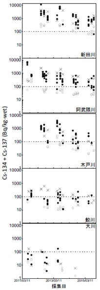 図6.3 福島県内5河川でのアユの内臓(●)及び筋肉(○)と、河床付着物(アユの餌生物である藻類及びシルト、×)の放射性セシウム濃度の時間変化