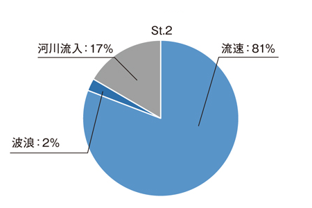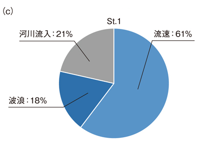 沿岸における濁度の変動(沈降粒子量の変動)は、流速と波浪のせん断力(海底土の再懸濁)と河川流入(河川からの土砂等の懸濁物)の3要因で説明できると考え、全濁度に対する3要因の寄与割合を重回帰分析(複数の要因の寄与度合いを求める手法)で計算しました。