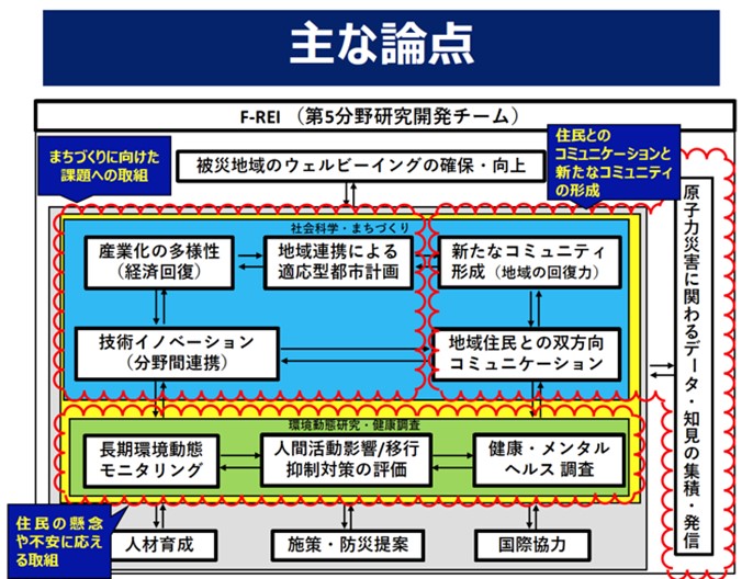 上記は「現在〜将来に向けた地域貢献」について言及されたものです。地域に根ざして研究活動を進める中では、地域にどう活動を理解してもらうかも大切な視点の一つです。放射線教育や原子力災害に関する防災情報の発信においてF-REIが地域にうまくコミュニケーションを取ることができれば、将来的には人材育成やF-REIの存在感向上にもつながるといった意見が出ました。