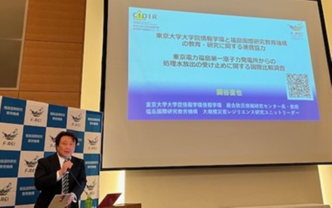 また、締結式後、東京大学大学院情報学環情報学環総合防災情報研究センター/F-REI大規模災害レジリエンス研究ユニットリーダーの関谷直也にて「東京電力福島第一原子力発電所からの処理水放出の受け止めに関する国際比較調査」と題し、講演を開催しました。